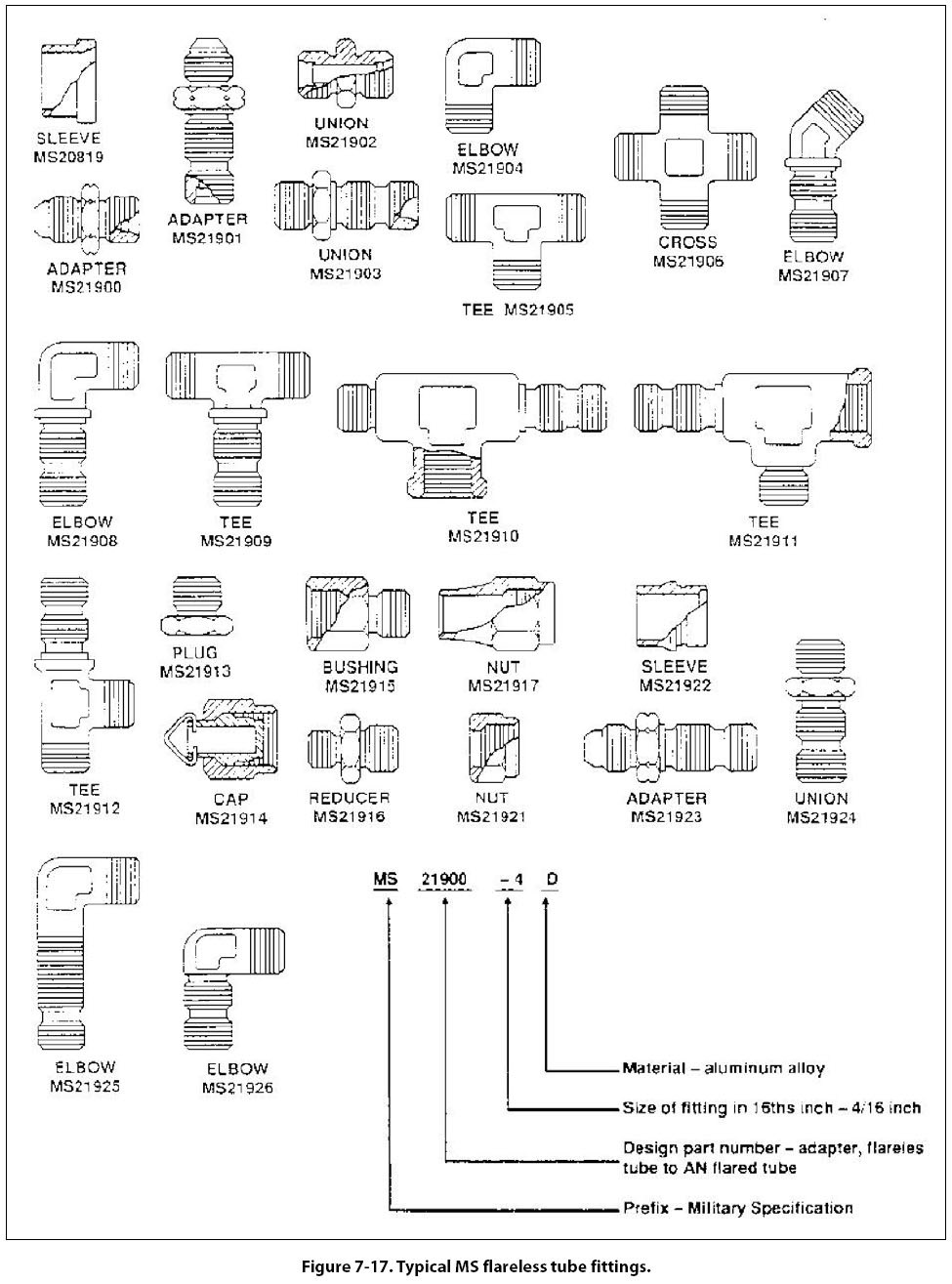 at the edge of the flare, and distributes the shearing action over a wider area for added strength. Fitting combinations composed of different alloys should be avoided to prevent dissimilar metal corrosion. As with all fitting combinations, ease of assembly, alignment, and proper lubrication should be assured when tightening fittings during installation. Standard AN fittings are identified by their black or blue color. All AN steel fittings are colored black, all AN aluminum fittings are colored blue, and aluminum bronze fittings are cadmium plated and natural in appearance. A sampling of AN fittings is shown in Figure 7-16. Table 7-2 contains additional information on sizes, torques, and bend radii.