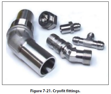 Cryofit Fittings Many transport category aircraft use Cryofit fittings to join hydraulic lines in areas where routine disconnections are not required. Cryofit fittings are standard fittings with a cryogenic sleeve. The sleeve is made of a shape memory alloy, Tinel™. The sleeve is manufactured 3 percent smaller, frozen in liquid nitrogen, and expanded to 5 percent larger than the line. During installation, the fitting is removed from the liquid nitrogen and inserted onto the tube. During a 10 to 15 second warming up period, the fitting contracts to its original size (3 percent smaller), biting down on the tube, forming a permanent seal. Cryofit fittings can only be removed by cutting the tube at the sleeve, though this leaves enough room to replace it with a swaged fitting without replacing the hydraulic line. It is frequently used with titanium tubing. The shape memory technology is also used for end fittings, flared fittings, and flareless fittings. [Figure 7-21]