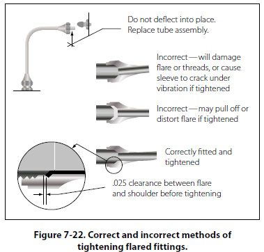 Rigid Tubing Installation and Inspection Before installing a line assembly in an aircraft, inspect the line carefully. Remove dents and scratches, and be sure all nuts and sleeves are snugly mated and securely fitted by proper flaring of the tubing. The line assembly should be clean and free of all foreign matter. Connection and Torque Never apply compound to the faces of the fitting or the flare, for it will destroy the metal-to-metal contact between the fitting and flare, a contact which is necessary to produce the seal. Be sure that the line assembly is properly aligned before tightening the fittings. Do not pull the installation into place with torque on the nut. Correct and incorrect methods of installing flared tube assemblies are illustrated in Figure 7-22.
