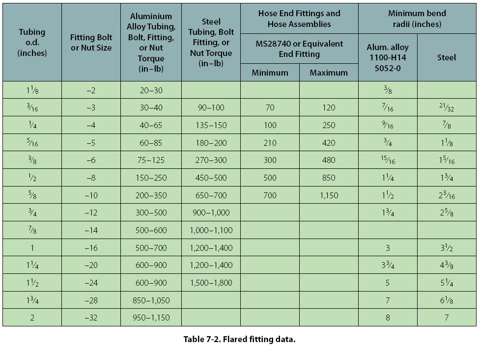Proper torque values are given in Table 7-2. Remember that these torque values are for flared-type fittings only. Always tighten fittings to the correct torque value when installing a tube assembly. Overtightening a fitting may badly damage or completely cut off the tube flare, or it may ruin the sleeve or fitting nut. Failure to tighten sufficiently also may be serious, as this condition may allow the line to blow out of the assembly or to leak under system pressure. The use of torque wrenches and the prescribed torque values prevents overtightening or undertightening. If a tube fitting assembly is tightened properly, it may be removed and retightened many times before reflaring is necessary.