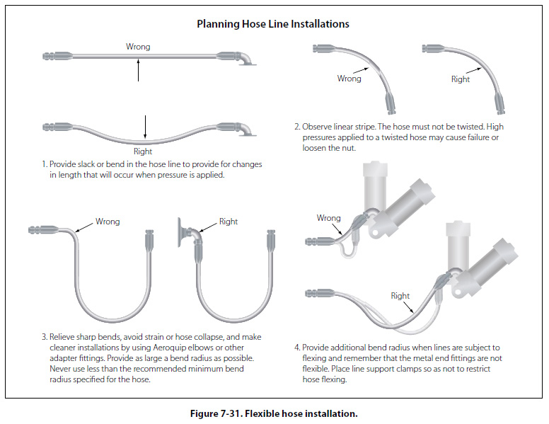 Installation of Flexible Hose Assemblies Slack—Hose assemblies must not be installed in a manner that will cause a mechanical load on the hose. When installing flexible hose, provide slack or bend in the hose line from 5 to 8 percent of its total length to provide for changes in length that will occur when pressure is applied. Flexible hose contracts in length and expands in diameter when pressurized. Protect all flexible hoses from excessive temperatures, either by locating the lines so they will not be affected or by installing shrouds around them. Flex—When hose assemblies are subject to considerable vibration or flexing, sufficient slack must be left between rigid fittings. Install the hose so that flexure does not occur at the end fittings. The hose must remain straight for at least two hose diameters from the end fittings. Avoid clamp locations that will restrict or prevent hose flexure. Twisting—Hoses must be installed without twisting to avoid possible rupture of the hose or loosening of the attaching nuts. Use of swivel connections at one or both ends will relieve twist stresses. Twisting of the hose can be determined from the identification stripe running along its length. This stripe should not spiral around the hose. Bending—To avoid sharp bends in the hose assembly, use elbow fittings, hose with elbow-type end fittings, or the appropriate bend radii. Bends that are too sharp will reduce the bursting pressure of flexible hose considerably below its rated value. [Figure 7-31]