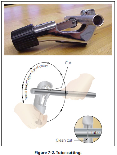 Sizes Metal tubing is sized by outside diameter (o.d.), which is measured fractionally in sixteenths of an inch. Thus, number 6 tubing is 6/16" (or 3/8") and number 8 tubing is 8/16" (or 1/2"), and so forth. The tube diameter is typically printed on all rigid tubing. In addition to other classifications or means of identification, tubing is manufactured in various wall thicknesses. Thus, it is important when installing tubing to know not only the material and outside diameter, but also the thickness of the wall. The wall thickness is typically printed on the tubing in thousands of an inch. To determine the inside diameter (i.d.) of the tube, subtract twice the wall thickness from the outside diameter. For example, a number 10 piece of tubing with a wall thickness of 0.063" has an inside diameter of 0.625" – 2(0.063") = 0.499". Fabrication of Metal Tube Lines Damaged tubing and fluid lines should be repaired with new parts whenever possible. Unfortunately, sometimes replacement is impractical and repair is necessary. Scratches, abrasions, or minor corrosion on the outside of fluid lines may be considered negligible and can be smoothed out with a burnishing tool or aluminum wool. Limitations on the amount of damage that can be repaired in this manner are discussed in this chapter under “Rigid Tubing Inspection and Repair." If a fluid line assembly is to be replaced, the fittings can often be salvaged; then the repair will involve only tube forming and replacement. Tube forming consists of four processes: Cutting, bending, flaring, and beading. If the tubing is small and made of soft material, the assembly can be formed by hand bending during installation. If the tube is 1/4" diameter or larger, hand bending without the aid of tools is impractical. Tube Cutting When cutting tubing, it is important to produce a square end, free of burrs. Tubing may be cut with a tube cutter or a hacksaw. The cutter can be used with any soft metal tubing, such as copper, aluminum, or aluminum alloy. Correct use of the tube cutter is shown in Figure 7-2. Special chipless cutters are available for cutting aluminum 6061-T6, corrosion resistant steel and titanium tubing.