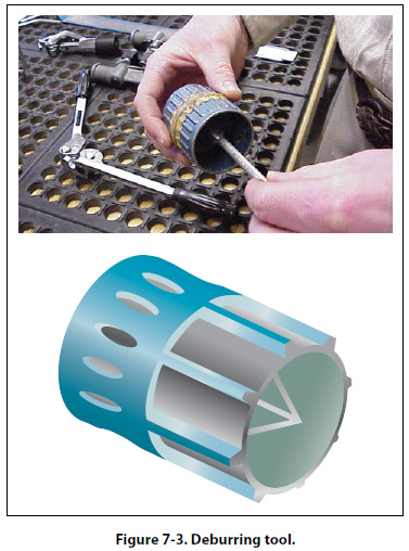 A new piece of tubing should be cut approximately 10 percent longer than the tube to be replaced to provide for minor variations in bending. Place the tubing in the cutting tool, with the cutting wheel at the point where the cut is to be made. Rotate the cutter around the tubing, applying a light pressure to the cutting wheel by intermittently twisting the thumbscrew. Too much pressure on the cutting wheel at one time could deform the tubing or cause excessive burring. After cutting the tubing, carefully remove any burrs from inside and outside the tube. Use a knife or the burring edge attached to the tube cutter. The deburring operation can be accomplished by the use of a deburring tool as shown in Figure 7-3. This tool is capable of removing both the inside and outside burrs by just turning the tool end for end.