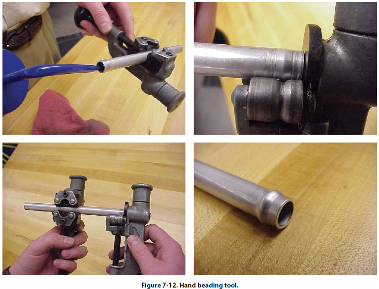 Separate rollers are required for the inside of each tubing size, and care must be taken to use the correct parts when beading. The hand beading tool works somewhat like the tube cutter in that the roller is screwed down intermittently while rotating the beading tool around the tubing. In addition, a small vise (tube holder) is furnished with the kit. Other methods and types of beading tools and machines are available, but the hand beading tool is used most often. As a rule, beading machines are limited to use with large diameter tubing, over 115/16", unless special rollers are supplied. The grip-die method of beading is confined to small tubing. |