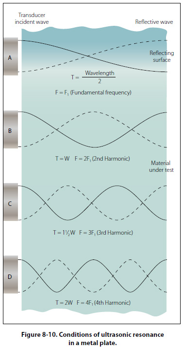 The beam or a portion thereof reflects successively from the surfaces of the material or any other discontinuity, including the edge of the piece. In straight beam testing, the horizontal distance on the screen between the initial pulse and the first back reflection represents the thickness of the piece; while in angle beam testing, this distance represents the width of the material between the searching unit and the opposite edge of the piece. Through Transmission Through transmission inspection uses two transducers, one to generate the pulse and another placed on the opposite surface to receive it. A disruption in the sound path will indicate a flaw and be displayed on the instrument screen. Through transmission is less sensitive to small defects than the pulse-echo method. Resonance This system differs from the pulse method in that the frequency of transmission may be continuously varied. The resonance method is used principally for thickness measurements when the two sides of the material being tested are smooth and parallel and the backside is inaccessible. The point at which the frequency matches the resonance point of the material being tested is the thickness determining factor. It is necessary that the frequency of the ultrasonic waves corresponding to a particular dial setting be accurately known. Checks should be made with standard test blocks to guard against possible drift of frequency. If the frequency of an ultrasonic wave is such that its wavelength is twice the thickness of a specimen (fundamental frequency), then the reflected wave will arrive back at the transducer in the same phase as the original transmission so that strengthening of the signal will occur. This results from constructive interference or a resonance and is shown as a high amplitude value on the indicating screen. If the frequency is increased such that three times the wavelength equals four times the thickness, the reflected signal will return completely out of phase with the transmitted signal and cancellation will occur. Further increase of the frequency causes the wavelength to be equal to the thickness again and gives a reflected signal in phase with the transmitted signal and a resonance once more. By starting at the fundamental frequency and gradually increasing the frequency, the successive cancellations and resonances can be noted and the readings used to check the fundamental frequency reading. [Figure 8-10]