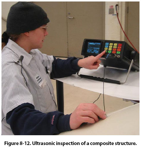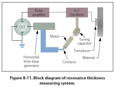 The change in frequency is synchronized with the horizontal sweep of a CRT. The horizontal axis thus represents a frequency range. If the frequency range contains resonances, the circuitry is arranged to present these vertically. Calibrated transparent scales are then placed in front of the tube, and the thickness can be read directly. The instruments normally operate between 0.25 millicycle (mc) and 10 mc in four or five bands. The resonance thickness instrument can be used to test the thickness of such metals as steel, cast iron, brass, nickel, copper, silver, lead, aluminum, and magnesium. In addition, areas of corrosion or wear on tanks, tubing, airplane wing skins, and other structures or products can be located and evaluated. Direct reading dial-operated units are available that measure thickness between 0.025 inch and 3 inches with an accuracy of better than ±1 percent. Ultrasonic inspection requires a skilled operator who is familiar with the equipment being used as well as the inspection method to be used for the many different parts being tested. [Figure 8-12]