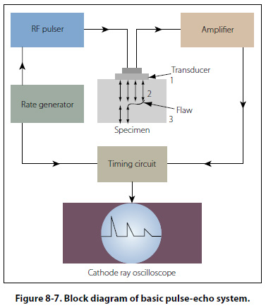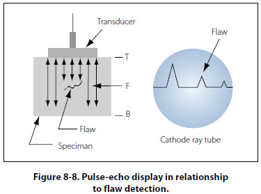 Pulse Echo Flaws are detected by measuring the amplitude of signals reflected and the time required for these signals to travel between specific surfaces and the discontinuity. [Figure 8-7]