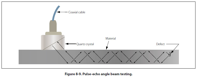 Pulse-echo instruments may also be used to detect flaws not directly underneath the probe by use of the anglebeam testing method. Angle beam testing differs from straight beam testing only in the manner in which the ultrasonic waves pass through the material being tested. As shown in Figure 8-9, the beam is projected into the material at an acute angle to the surface by means of a crystal cut at an angle and mounted in plastic.