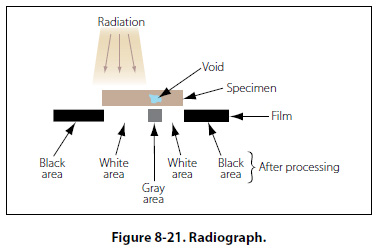 Indicating Mediums The various types of indicating mediums available for magnetic particle inspection may be divided into two general material types: wet and dry. The basic requirement for any indicating medium is that it produce acceptable indications of discontinuities in parts. The contrast provided by a particular indicating medium on the background or part surface is particularly important. The colors most extensively used are black and red for the wet procedure and black, red, and gray for the dry procedure. For acceptable operation, the indicating medium must be of high permeability and low retentivity. High permeability ensures that a minimum of magnetic energy will be required to attract the material to flux leakage caused by discontinuities. Low retentivity ensures that the mobility of the magnetic particles will not be hindered by the particles themselves becoming magnetized and attracting one another. Demagnetizing The permanent magnetism remaining after inspection must be removed by a demagnetization operation if the part is to be returned to service. Parts of operating mechanisms must be demagnetized to prevent magnetized parts from attracting filings, grindings, or chips inadvertently left in the system, or steel particles resulting from operational wear. An accumulation of such particles on a magnetized part may cause scoring of bearings or other working parts. Parts of the airframe must be demagnetized so they will not affect instruments. Demagnetization between successive magnetizing operations is not normally required unless experience indicates that omission of this operation results in decreased effectiveness for a particular application. Demagnetization may be accomplished in a number of different ways. A convenient procedure for aircraft parts involves subjecting the part to a magnetizing force that is continually reversing in direction and, at the same time, gradually decreasing in strength. As the decreasing magnetizing force is applied first in one direction and then the other, the magnetization of the part also decreases. Standard Demagnetizing Practice The simplest procedure for developing a reversing and gradually decreasing magnetizing force in a part involves the use of a solenoid coil energized by alternating current. As the part is moved away from the alternating field of the solenoid, the magnetism in the part gradually decreases. A demagnetizer whose size approximates that of the work should be used. For maximum effectiveness, small parts should be held as close to the inner wall of the coil as possible. Parts that do not readily lose their magnetism should be passed slowly in and out of the demagnetizer several times and, at the same time, tumbled or rotated in various directions. Allowing a part to remain in the demagnetizer with the current on accomplishes very little practical demagnetization. The effective operation in the demagnetizing procedure is that of slowly moving the part out of the coil and away from the magnetizing field strength. As the part is withdrawn, it should be kept directly opposite the opening until it is 1 or 2 feet from the demagnetizer. The demagnetizing current should not be cut off until the part is 1 or 2 feet from the opening as the part may be remagnetized if current is removed too soon. Another procedure used with portable units is to pass alternating current through the part being demagnetized, while gradually reducing the current to zero. Radiographic X and gamma radiations, because of their unique ability to penetrate material and disclose discontinuities, have been applied to the radiographic (x-ray) inspection of metal fabrications and nonmetallic products. The penetrating radiation is projected through the part to be inspected and produces an invisible or latent image in the film. When processed, the film becomes a radiograph or shadow picture of the object. This inspection medium and portable unit provides a fast and reliable means for checking the integrity of airframe structures and engines. [Figure 8-21]