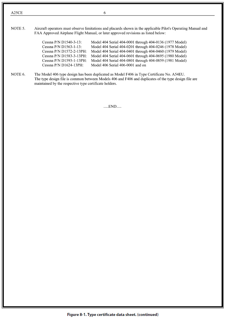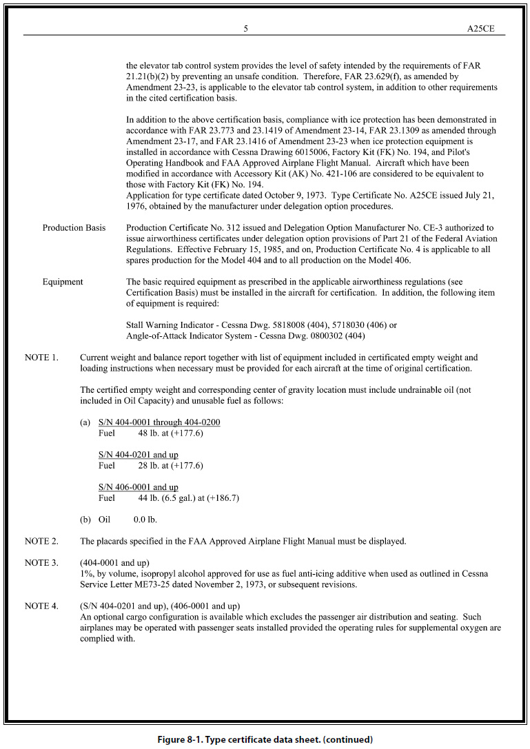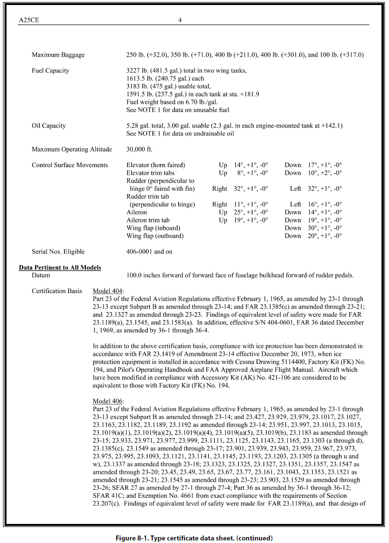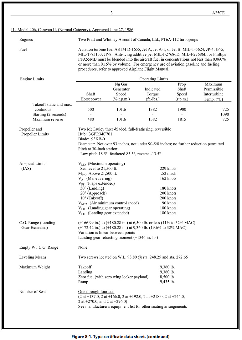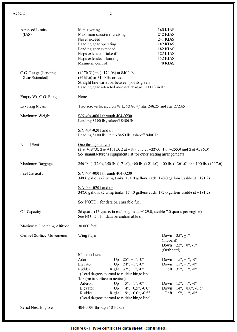 It is not within the scope of this handbook to list all the items that can be shown on the type certificate data sheets. Those items listed above serve only to acquaint aviation mechanics with the type of information generally included on the data sheets. Type certificate data sheets may be many pages in length. Figure 8-1 shows a typical TCDS.
