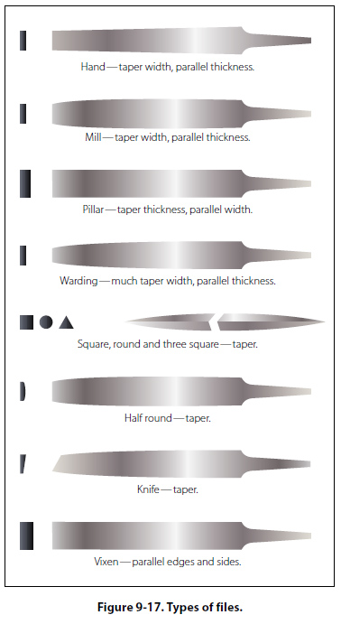 Hand files—These are parallel in width and tapered in thickness. They have one safe edge (smooth edge) which permits filing in corners, and on other work where a safe edge is required. Hand files are double cut and used principally for finishing flat surfaces and similar work. Flat files— These files are slightly tapered toward the point in both width and thickness. They cut on both edges as well as on the sides. They are the most common files in use. Flat files are double cut on both sides and single cut on both edges. Mill files—These are usually tapered slightly in thickness and in width for about one-third of their length. The teeth are ordinarily single cut. These files are used for drawfiling and to some extent for filing soft metals. Square files—These files may be tapered or blunt and are double cut. They are used principally for filing slots and key seats, and for surface filing. Round or rattail files—These are circular in cross section and may be either tapered or blunt and single or double cut. They are used principally for filing circular openings or concave surfaces. Triangular and three square files—These files are triangular in cross section. Triangular files are single cut and are used for filing the gullet between saw teeth. Three square files, which are double cut, may be used for filing internal angles, clearing out corners, and filing taps and cutters. Half-round files—These files cut on both the flat and round sides. They may be single or double cut. Their shape permits them to be used where other files would be unsatisfactory. Lead float files—These are especially designed for use on soft metals. They are single cut and are made in various lengths. Warding file—Rectangular in section and tapers to narrow point in width. This file is used for narrow space filing where other files cannot be used. Knife file—Knife blade section. This file is used by tool and die makers on work having acute angles. Wood file—Same section as flat and half-round files. This file has coarser teeth and is especially adaptable for use on wood. Vixen (curved-tooth files)—Curved-tooth files are especially designed for rapid filing and smooth finish on soft metals and wood. The regular cut is adapted for tough work on cast iron, soft steel, copper, brass, aluminum, wood, slate, marble, fiber, rubber, and so forth. The fine cut gives excellent results on steel, cast iron, phosphor bronze, white brass, and all hard metals. The smooth cut is used where the amount of material to be removed is very slight, but where a superior finish is desired. The following methods are recommended for using files:
