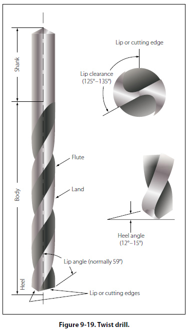 Drills There are generally four types of portable drills used in aviation for holding and turning twist drills. Holes 1/4 inch in diameter and under can be drilled using a hand drill. This drill is commonly called an “egg beater." The breast drill is designed to hold larger size twist drills than the hand drill. In addition, a breastplate is affixed at the upper end of the drill to permit the use of body weight to increase the cutting power of the drill. Electric and pneumatic power drills are available in various shapes and sizes to satisfy almost any requirement. Pneumatic drills are preferred for use around flammable materials, since sparks from an electric drill are a fire or explosion hazard. Twist Drills A twist drill is a pointed tool that is rotated to cut holes in material. It is made of a cylindrical hardened steel bar having spiral flutes (grooves) running the length of the body, and a conical point with cutting edges formed by the ends of the flutes. Twist drills are made of carbon steel or high-speed alloy steel. Carbon steel twist drills are satisfactory for the general run of work and are relatively inexpensive. The more expensive high-speed twist drills are used for the tough materials such as stainless steels. Twist drills have from one to four spiral flutes. Drills with two flutes are used for most drilling; those with three or four flutes are used principally to follow smaller drills or to enlarge holes. The principal parts of a twist drill are the shank, the body, and the heel.
