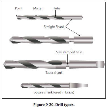 [Figure 9-19] The drill shank is the end that fits into the chuck of a hand or power drill. The two shank shapes most commonly used in hand drills are the straight shank and the square or bit stock shank. The straight shank generally is used in hand, breast, and portable electric or pneumatic drills; the square shank is made to fit into a carpenter’s brace. Tapered shanks generally are used in machine shop drill presses. [Figure 9-20]