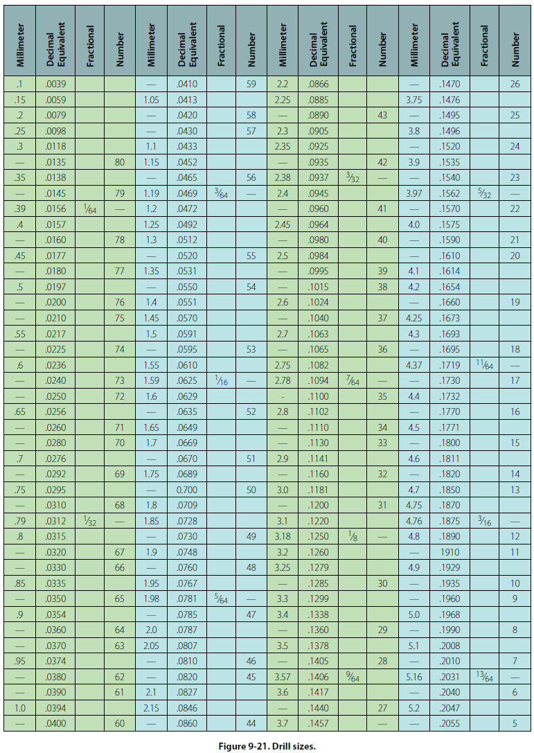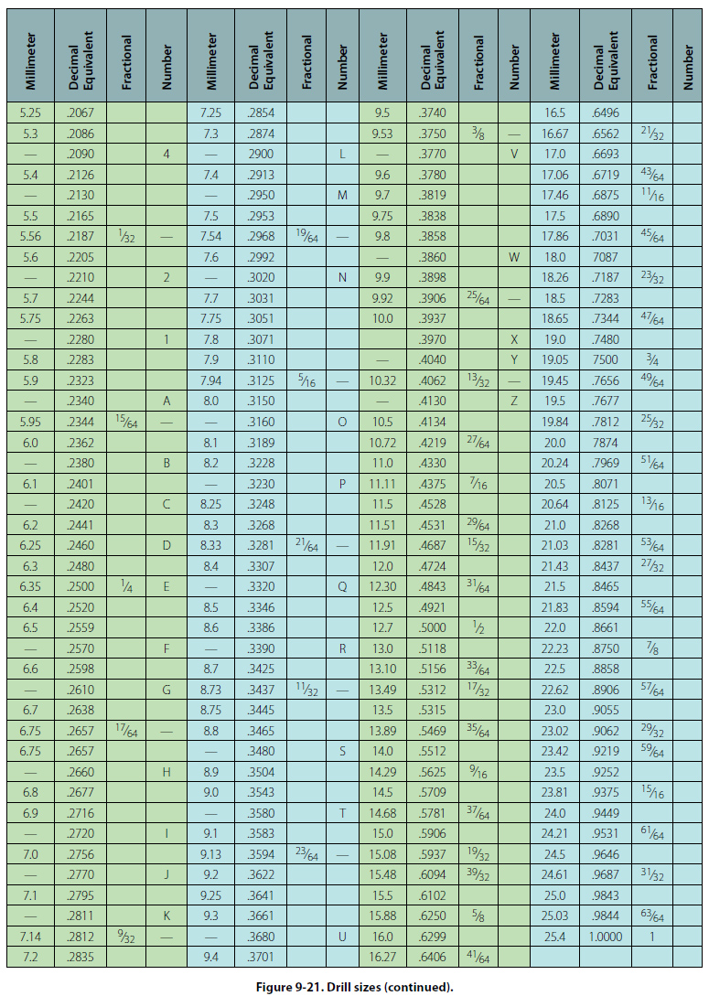 The metal column forming the core of the drill is the body. The body clearance area lies just back of the margin; it is slightly smaller in diameter than the margin, to reduce the friction between the drill and the sides of the hole. The angle at which the drill point is ground is the lip clearance angle. On standard drills used to cut steel and cast iron, the angle should be 59° from the axis of the drill. For faster drilling of soft materials, sharper angles are used. The diameter of a twist drill may be given in one of three ways: (1) by fractions, (2) letters, or (3) numbers. Fractionally, they are classified by sixteenths of an inch (from 1/16 to 3.5 inch), by thirty-seconds (from 1/32 to 2.5 inch), or by sixty-fourths (from 1/64 to 11/4 inch). For a more exact measurement, a letter system is used with decimal equivalents: A (0.234 inch) to Z (0.413 inch). The number system of classification is most accurate: No. 80 (0.0314 inch) to No. 1 (0.228 inch). Drill sizes and their decimal equivalents are shown in Figure 9-21.