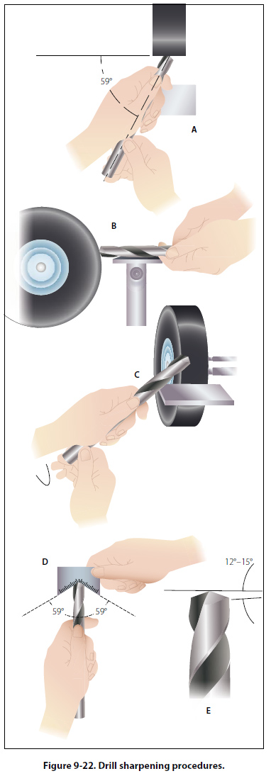 The twist drill should be sharpened at the first sign of dullness. For most drilling, a twist drill with a cutting angle of 118° (59° on either side of center) will be sufficient; however, when drilling soft metals, a cutting angle of 90° may be more efficient. Typical procedures for sharpening drills are as follows: [Figure 9-22]
