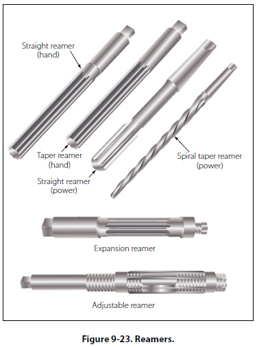 Reamers Reamers are used to smooth and enlarge holes to exact size. Hand reamers have square end shanks so that they can be turned with a tap wrench or similar handle. The various types of reamers are illustrated in Figure 9-23.