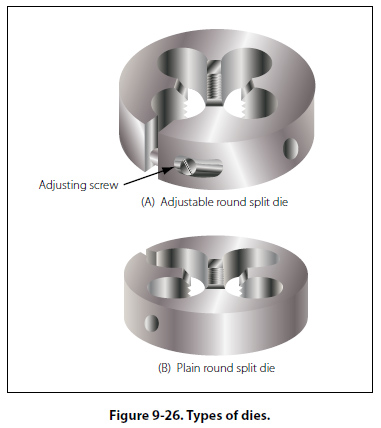 The taper tap is used to begin the tapping process, because it is tapered back for 6 to 7 threads. This tap cuts a complete thread when it is cutting above the taper. It is the only tap needed when tapping holes that extend through thin sections. The plug tap supplements the taper tap for tapping holes in thick stock. The bottoming tap is not tapered. It is used to cut full threads to the bottom of a blind hole. Dies may be classified as adjustable round split die and plain round split die. The adjustable split die has an adjusting screw that can be tightened so that the die is spread slightly. By adjusting the die, the diameter and fit of the thread can be controlled. [Figure 9-26]