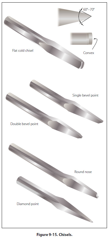 Chisels A chisel is a hard steel cutting tool that can be used for cutting and chipping any metal softer than the chisel itself. It can be used in restricted areas and for such work as shearing rivets, or splitting seized or damaged nuts from bolts. [Figure 9-15]