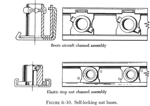 Selflocking nut bases are made in a number of forms and materials for riveting and welding to aircraft structure or parts. (See figure 6-10.) Certain applications require the installation of selflocking nuts in channels, an arrangement which permits the attachment of many nuts with only a few rivets. These channels are track-like bases with regularly spaced nuts which are either removable or nonremovable. The removable type carries a floating nut, which can be snapped in or out of the channel, thus making possible the easy removal of damaged nuts. Nuts such as the clinch-type and spline-type which depend on friction for their anchorage are not acceptable for use in aircraft structures.