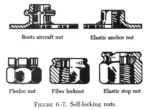 Most of the familiar types of nuts, including the plain nut, the castle nut, the castellated shear nut, the plain hex nut, the light hex nut, and the plain check nut are the nonselflocking type. (See figure 6-6.)