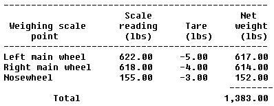 The empty weight of the aircraft is determined by adding the net weight on each weighing point. The net weight is the actual scale reading, less the tare weight.