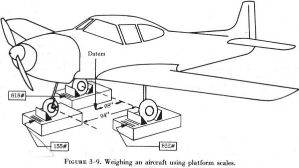 | After the aircraft has been placed on the scales (figure 3-9) and leveled, hang plumb bobs from the datum, the main weighing point, and the tail or nose weighing point so that the points of the plumb bobs touch the floor. Make a chalk mark on the floor at the points of contact. If desired, a chalk line may be drawn connecting the chalk marks. This will make a clear pattern of the |
