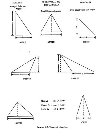 A = 252 NEXT: Perform the indicated multiplication; the answer will be the total area in square inches. A = 25 x 25 = 625 sq in Triangles A triangle is a three sided polygon. There are three basic types of triangle: scalene, equilateral or equiangular, and isosceles. A scalene triangle is one in which all sides and angles are unequal, whereas the equilateral triangle, being just the opposite, has equal sides and equal angles. A triangle that has two equal sides and angles is known as an isosceles triangle. Triangles may be further classified as to right, obtuse, or acute. These terms are descriptive of the included angles of the triangle. A right triangle is one that has one angle measuring 90°. In an obtuse triangle, one angle is greater than 90°, while in an acute triangle all the angles are less than 90°. The various types of triangles are shown in figure 1-7. |