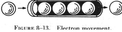 It can be seen that a ball introduced in one end of the tube, which represents a conductor, will immediately cause a ball to be emitted at the opposite end of the tube. Even if the tube were long enough to reach clear across the country, this effect could still be visualized as being instantaneous. Thus, electric current flow can be viewed as occurring instantaneously, even though it is a result of a comparatively slow drift of electrons.