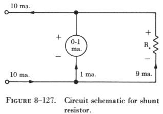 The value of a shunt resistor can be computed by applying the basic rules for parallel circuits. If a 50 millivolt 0 - 1 milliammeter is to be used to measure values of current up to 10 ma., the following procedure can be used: The first step involves drawing a schematic of the meter shunted by a resistor labeled Rs (shunt resistor), as shown in figure 8-127. |