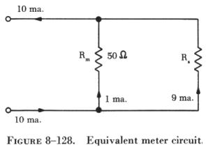 Since the sensitivity of the meter is known, the meter resistance can be computed. The circuit is then redrawn as shown in figure 8-128, and the branch currents can be computed, since a maximum of 1 ma. can flow through the meter. The voltage drop across Rs is the same as that across the meter, Rm: