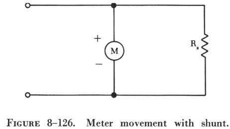 A 0 - 1 milliammeter movement may be used to measure currents greater than 1 ma. by connecting a resistor in parallel with the movement. The parallel resistor is called a shunt because it bypasses a portion of the current around the movement, extending the range of the ammeter. A schematic drawing of a meter movement with a shunt connected across it to extend its range is shown in figure 8-126. |
