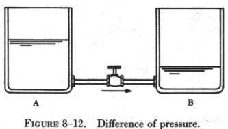 The flow of electrons of electric current can be compared to the flow of water between two interconnected water tanks when a difference of pressure exists between two tanks. Figure 8-12 shows the level of water in tank A to be at a higher level than the water level in tank B. If the valve in the interconnecting line between the tanks is opened, water will flow from tank A into tank B until the level of water is the same in both tanks.