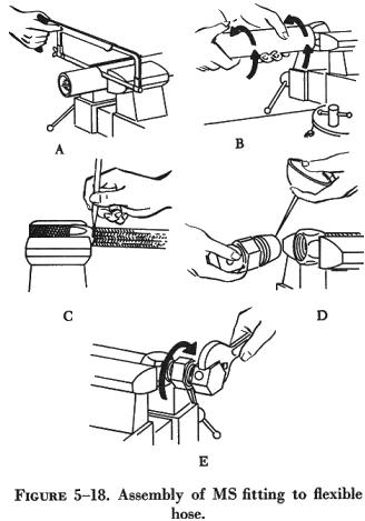 Mark the hose position around the hose at the rear of the socket using a grease pencil or painted line. Insert the nipple into the nut and tighten the nipple and nut on the assembly tool. If an assembly tool is not available, a mating AN815 adapter may be used. Using a wrench on the assembly tool, screw the nipple into the socket and hose. A 1/32 to 1/16 inch clearance between the nut and sleeve is required so that the nut will swivel freely when the assembly tool is removed. After assembly, always make sure all foreign matter is removed from inside the hose by blowing out with compressed air. Proof-test After Assembly All flexible hose must be proof-tested after assembly by plugging or capping one end of the hose and applying pressure to the inside of the hose assembly. The proof-test medium may be a liquid or a gas. For example, hydraulic, fuel, and oil lines are generally tested using hydraulic oil or water, whereas air or instrument lines are tested with dry, oil free air or nitrogen. When testing with a liquid, all trapped air is bled from the assembly prior to tightening the cap or plug. Hose tests, using a gas, are conducted underwater. In all cases follow the hose manufacturer's instructions for proof-test pressure and fluid to be used when testing a specific hose assembly. |