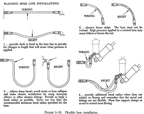 Installation of Flexible Hose Assemblies Flexible hose must not be twisted on installation, since this reduces the life of the hose considerably and may also loosen the fittings. Twisting of the hose can be determined from the identification stripe running along its length. This stripe should not spiral around the hose. Flexible hose should be protected from chafing by wrapping it with tape, but only where necessary. The minimum bend radius for flexible hose varies according to size and construction of the hose and the pressure under which the hose is to operate. Bends that are too sharp will reduce the bursting pressure of flexible hose considerably below its rated value (figure 5-19). |