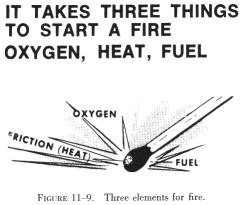 | Three things are required for a fire. Fuel - something that will in the presence of heat combine with oxygen, thereby releasing more heat and as a result reduces itself to other chemical compounds. Heat - can be considered the catalyst which accelerates the combining of oxygen with fuel, in turn releasing more heat. Oxygen - element which combines chemically with another substance through the process of oxidation. Rapid oxidation, accompanied by a noticeable release of heat and light is called combustion or burning (figure 11-9). Remove any one of these things and the fire goes out. |