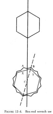 Solid, nonadjustable wrenches with open parallel jaws on one or both ends are known as open end wrenches. These wrenches may have their jaws parallel to the handle or at an angle up to 90°; most are set at an angle of 15°. Basically. the wrenches are designed to fit a nut, bolthead, or other object which makes it possible to exert a turning action. Box end wrenches are popular tools because of their usefulness in close quarters. They are called box wrenches since they box, or completely surround, the nut or bolthead. Practically all box end wrenches are made with 12 points so they can be used in places having as little as 15° swing. In figure 12-4, point A on the illustrated double broached hexagon wrench is nearer the center line of the head and the wrench handle than point B, and also the center line of nut C. If the wrench is inverted and installed on nut C, point A will be centered over side "Y" instead of side "X". The center line of the handle will now be in the dotted line position. It is by reversing (turning the wrench over) the position of the wrench that a 15° arc may be made with the wrench handle. |