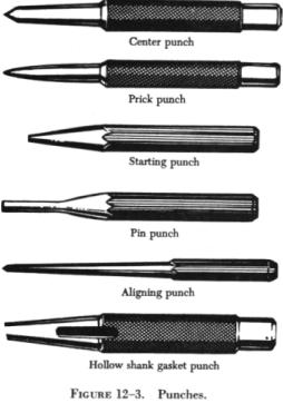 Punches are used to locate centers for drawing circles, to start holes for drilling, to punch holes in sheet metal, to transfer location of holes in patterns, and to remove damaged rivets, pins, or bolts. Solid or hollow punches are the two types generally used. Solid punches are classified according to the shape of their points. Figure 12-3 shows several types of punches. Prick punches are used to place reference marks on metal. This punch is often used to transfer dimensions from a paper pattern directly on the metal. To do this, first place the paper pattern directly on the metal. Then go over the outline of the pattern with the prick punch, tapping it lightly with a small hammer and making slight indentations on the metal at the major points on the drawing. These indentations can then be used as reference marks for cutting the metal. A prick punch should never be struck a heavy blow with a hammer because it may bend the punch or cause excessive damage to the material being worked. |