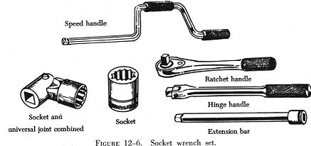 Sockets with detachable handles usually come in sets and fit several types of handles, such as the T, ratchet, screwdriver grip, and speed handle. Socket wrench handles have a square lug on one end that fits into a square recess in the socket head. The two parts are held together by a light spring loaded poppet. Two types of sockets, a set of handles, and an extension bar are shown in figure 12-6.