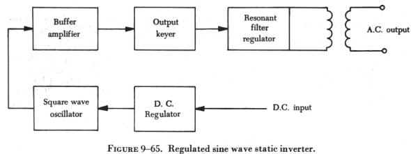 The alternator is a three phase, four pole, star connected ac generator. The dc input is supplied to the generator field coils and connected to ground through a carbon pile voltage regulator. The output is taken off the armature through three slip rings to provide three phase power. The inverter would be a single phase inverter if it had a single armature winding and one slip ring. The frequency of this type unit is determined by the speed of the motor and the number of generator poles. Inductor-Type Rotary Inverter Inductor-type inverters use a rotor made of soft iron laminations with grooves cut laterally across the surface to provide poles that correspond to the number of stator poles, as illustrated in figure 9-62. The field coils are wound on one set of stationary poles and the ac armature coils on the other set of stationary poles. When dc is applied to the field coils, a magnetic field is produced. The rotor turns within the field coils and, as the poles on the rotor align with the stationary poles, a low reluctance path for flux is established from the field pole through the rotor poles to the ac armature pole and through the housing back to the field pole. In this circumstance, there will be a large amount of magnetic flux linking the ac coils. When the rotor poles are between the stationary poles, there is a high reluctance path for flux, consisting mainly of air; then, there will be a small amount of magnetic flux linking the ac coils. This increase and decrease in flux density in the stator induces an alternating current in the ac coils. The frequency of this type of inverter is determined by the number of poles and the speed of the motor. The voltage is controlled by the dc stator field current. A cutaway view of an inductor-type rotary inverter is shown in figure 9-63. Figure 9-64 is a simplified diagram of a typical aircraft ac power distribution system, utilizing a main and a standby rotary inverter system. Static Inverters In many applications where continuous dc voltage must be converted to alternating voltage, static inverters are used in place of rotary inverters or motor generator sets. The rapid progress being made by the semiconductor industry is extending the range of applications of such equipment into voltage and power ranges which would have been impractical a few years ago. Some such applications are power supplies for frequency sensitive military and commercial ac equipment, aircraft emergency ac systems, and conversion of wide frequency range power to precise frequency power. The use of static inverters in small aircraft also has increased rapidly in the last few years, and the technology has advanced to the point that static inverters are available for any requirement filled by rotary inverters. For example, 250 VA emergency ac supplies operated from aircraft batteries are in production, as are 2,500 VA main ac supplies operated from a varying frequency generator supply. This type of equipment has certain advantages for aircraft applications, particularly the absence of moving parts and the adaptability to conduction cooling. Static inverters, referred to as solid state inverters, are manufactured in a wide range of types and models, which can be classified by the shape of the ac output waveform and the power output capabilities. One of the most commonly used static inverters produces a regulated sine wave output. A block diagram of a typical regulated sine wave static inverter is shown in figure 9-65. This inverter converts a low dc voltage into higher ac voltage. The ac output voltage is held to a very small voltage tolerance, a typical variation of less than 1 percent with a full input load change. Output taps are normally provided to permit selection of various voltages; for example, taps may be provided for a 105, 115, and 125 volt ac outputs. Frequency regulation is typically within a range of one cycle for a 0 - 100 percent load change.