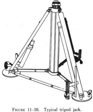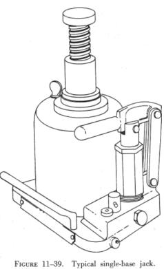 On collet equipped jacks, the collet should be kept within two threads of the lift tube cylinder during raising, and screwed down firmly to the cylinder after jacking is completed to prevent settling. Before releasing jack pressure and lowering the aircraft, make certain that all cribbing, workstands, equipment, and persons are clear of the aircraft, that the landing gear is down and locked, and that all ground locking devices are properly installed. Jacking One Wheel of an Aircraft When only one wheel has to be raised to change a tire or to grease wheel bearings, a low single base jack is used. Before the wheel is raised, the remaining wheels must be chocked fore and aft to prevent movement of the aircraft. If the aircraft is equipped with a tailwheel, it must be locked. The wheel should be raised only high enough to clear the concrete surface. Figure 11-42 shows a wheel being raised using a single base jack. |