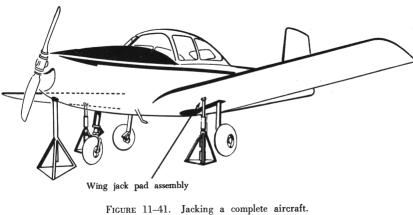 Most aircraft have jack pads located at the jack points. Others have removable jack pads that are inserted into receptacles bolted in place prior to jacking. The correct jack pad should be used in all cases. The function of the jack pad is to ensure that the aircraft load is properly distributed at the jack point and to provide a convex bearing surface to mate with the concave jack stem. Figure 11-40 illustrates two types of jack pads. Prior to jacking, determine if the aircraft configuration will permit jacking. There may be equipment or fuel which has to be removed if serious structural damage is to be avoided during jacking. If any other work is in progress on the aircraft, ascertain if any critical panels have been removed. On some aircraft the stress panels or plates must be in place when the aircraft is jacked to avoid structural damage. Extend the jacks until they contact the jack pads. A final check for