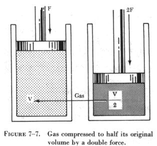 KINETIC THEORY OF GASES The simple structure of gases makes them readily adaptable to mathematical analysis from which has evolved a detailed theory of the behavior of gases. This is called the kinetic theory of gases. The theory assumes that a body of gas is composed of identical molecules which behave like minute elastic spheres, spaced relatively far apart and continuously in motion. The degree of molecular motion is dependent upon the temperature of the gas. Since the molecules are continuously striking against each other and against the walls of the container, an increase in temperature with the resulting increase in molecular motion causes a corresponding increase in the number of collisions between the molecules. The increased number of collisions results in an increase in pressure because a greater number of molecules strike against the walls of the container in a given unit of time. If the container were an open vessel, the gas would expand and overflow from the container. However, if the container is sealed and possesses elasticity (such as a rubber balloon), the increased pressure causes the container to expand. For instance, when making a long drive on a hot day, the pressure in the tires of an automobile increases, and a tire which appeared to be somewhat "soft" in cool morning temperature may appear normal at a higher midday temperature. Such phenomena as these have been explained and set forth in the form of laws pertaining to gases and tend to support the kinetic theory. At any given instant, some molecules of a gas are moving in one direction, some in another direction; some are traveling fast while some are traveling slowly; some may even be in a state of rest. The combined effect of these varying velocities corresponds to the temperature of the gas. In any considerable amount of gas, there are so many molecules present that in accordance with the "laws of probability" some average velocity can be found. If this average velocity were possessed by every molecule in the gas, it would produce the same effect at a given temperature as the total of the many varying velocities. Boyle's Law As previously stated, compressibility is an outstanding characteristic of gases. The English scientist Robert Boyle was among the first to study this characteristic which he called the "springiness of air." By direct measurement he discovered that when the temperature of a combined sample of gas was kept constant and the pressure doubled, the volume was reduced to half the former value; as the applied pressure was decreased, the resulting volume increased. From these observations, he concluded that for a constant temperature the product of the volume and pressure of an enclosed gas remains constant. Boyle's law is normally stated: "The volume of an enclosed dry gas varies inversely with its pressure, provided the temperature remains constant." |
