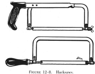Hacksaws The common hacksaw has a blade, a frame, and a handle. The handle can be obtained in two styles, pistol grip and straight (figure 12-8). Hacksaw blades have holes in both ends; they are mounted on pins attached to the frame. When installing a blade in a hacksaw frame, mount the blade with the teeth pointing forward, away from the handle. |