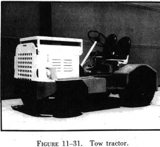 When the aircraft is stopped, the brakes of the towing vehicle alone should not be relied upon to stop the aircraft. The man in the cockpit should coordinate the use of the aircraft brakes with those of the towing vehicle. A typical tow tractor (or tug) is shown in figure 11-31. The attachment of the tow bar will vary on different types of aircraft. Aircraft equipped with tailwheels are generally towed forward by attaching the tow bar to the tow rings on the main landing gear. In most cases it is permissible to tow the aircraft in reverse by attaching the tow bar to the tailwheel axle. Anytime an aircraft equipped with a tailwheel is towed, the tailwheel must be unlocked or the tailwheel locking mechanism will be damaged or broken. |