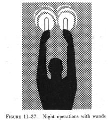 Taxi signals are usually given at night with the aid of illuminated wands attached to flashlights (figure 11-37). Night signals are made in the same manner as day signals with the exception of the stop signal. The stop signal used at night is the "emergency stop" signal. This signal is made by crossing the wands to form a lighted "X" above and in front of the head. |