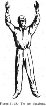 Figure 11-33 shows a taxi signalman indicating his readiness to assume