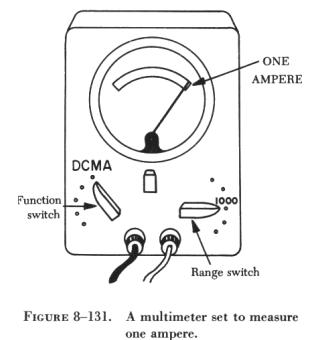 In figure 8-132, a multimeter properly set to measure current flow is connected