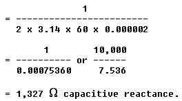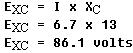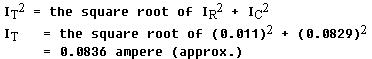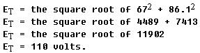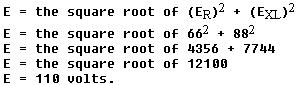 The sum of these two voltages does not equal the applied voltage, since the current leads the voltage. To find the applied voltage, the formula ET = the square root of (ER)2 + (EXC)2 is used.