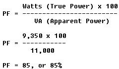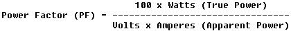 When there is capacitance or inductance in the circuit, the current and voltage are not exactly in phase, and the true power is less than the apparent power. The true power is obtained by a wattmeter reading. The ratio of the true power to the apparent power is called the power factor and is usually expressed in percent. In equation form, the relationship is:
