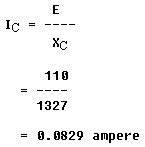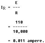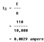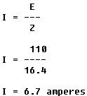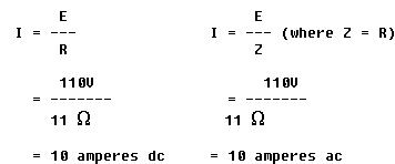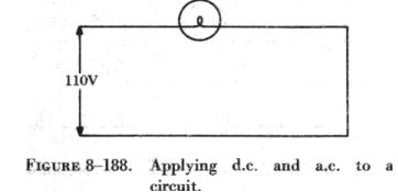 | If an ac circuit consists of resistance only, the value of the impedance is the same as the resistance, and Ohm's law for an ac circuit, I = E/Z, is exactly the same as for a dc circuit. In figure 8-188 a series circuit containing a lamp with 11 ohms resistance connected across a source is illustrated. To find how much current will flow if 110 volts dc are applied and how much current will flow if 110 volts ac are applied, the following examples are solved: | ![]() |
